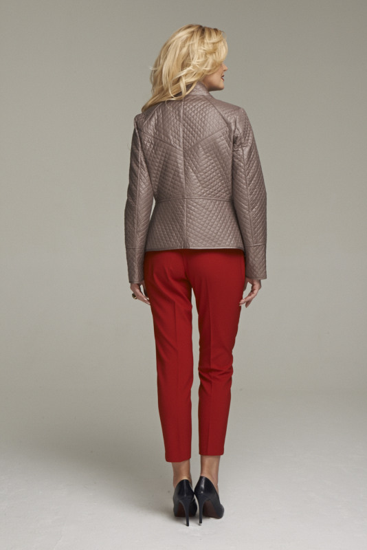 Жакет из стеганного двухстороннего полотна, прилегающего силуэта с отрезной баской. Застежка на молнию цвета белое золото. Карманы расположены по линии баски и декорированы металлической фурнитурой. Длина по спинке 56 см., длина рукава 63 см.