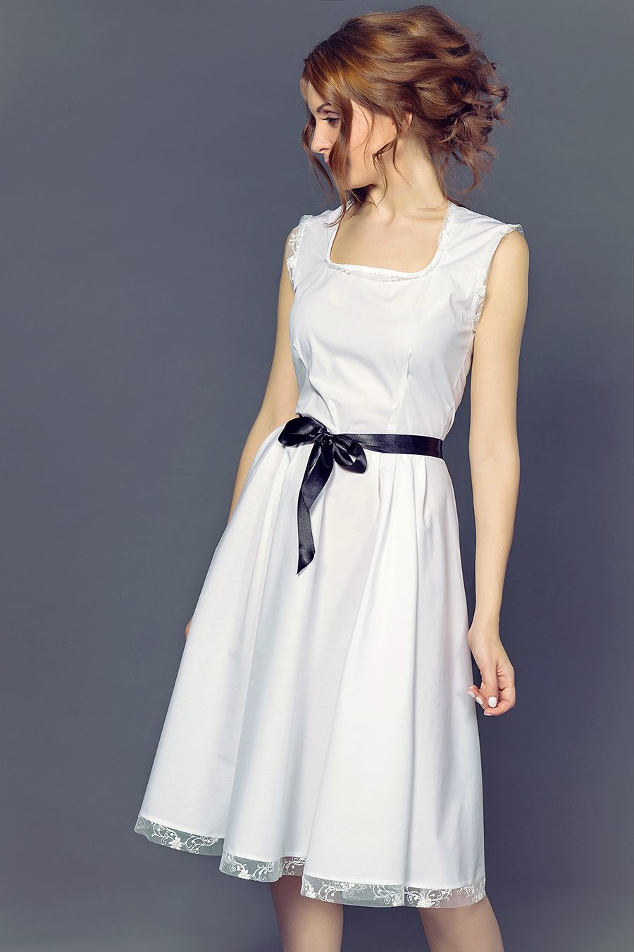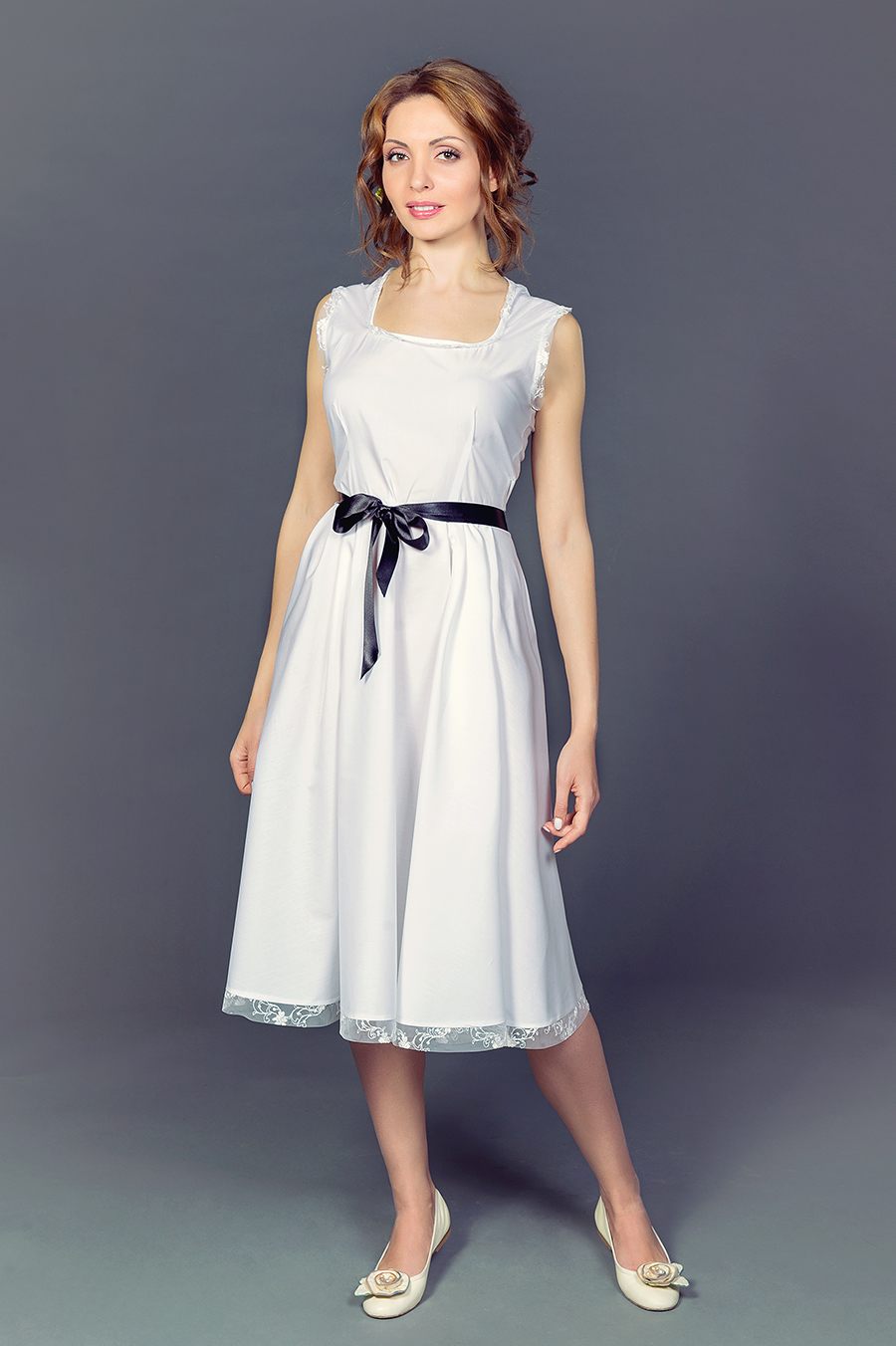 Потайная молния по средней линии спинки. Длина по средней линии спинки 105см. Горловина, подол и рукава отделаны кружевом. Второй вариант-с поясом из черной атласной ленты