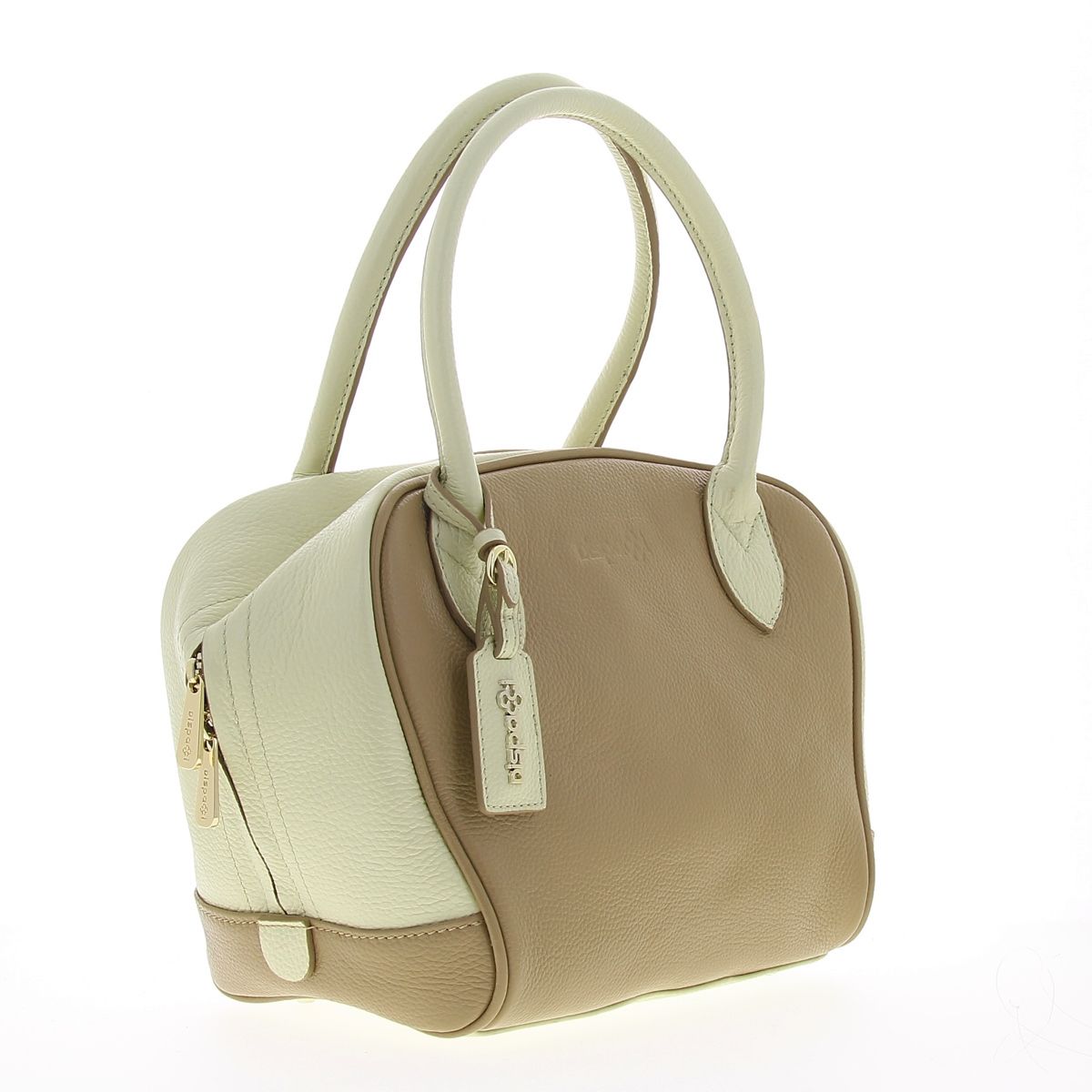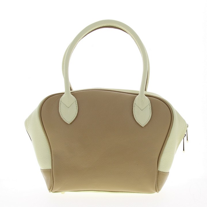 Женская сумочка DISPACCI из натуральной кожи, выполнена в сочетании белого и бежевого цвета. Цвет фурнитуры - светлое золото. Сумка закрывается на общую металлическую молнию. Внутри имеется одно главное отделение, боковой карман на молнии, и кармашки для мобильного телефона и мелочей. На дне имеются ножки. Модель имеет две ручки. Высота ручек - 15 см. Оригинальная сумочка из мягкой кожи, прекрасно подойдет для весенне-летнего образа, а сочетании двух цветов в аксессуарах сейчас как никогда в моде! Идеальный вариант для тех кто любит удобство и стиль!
