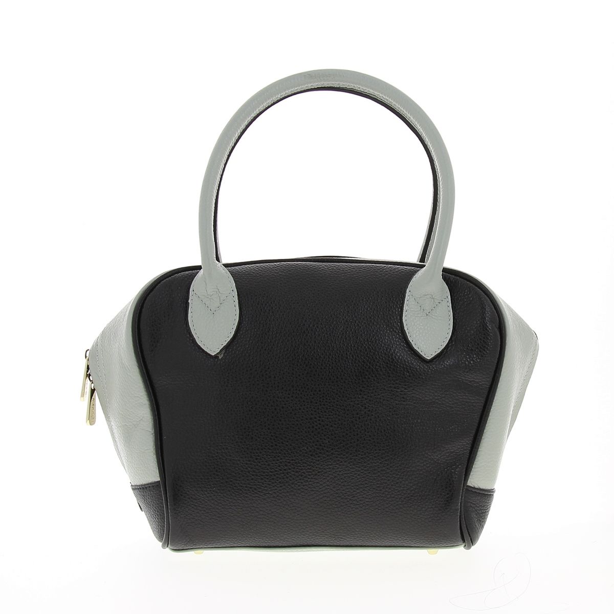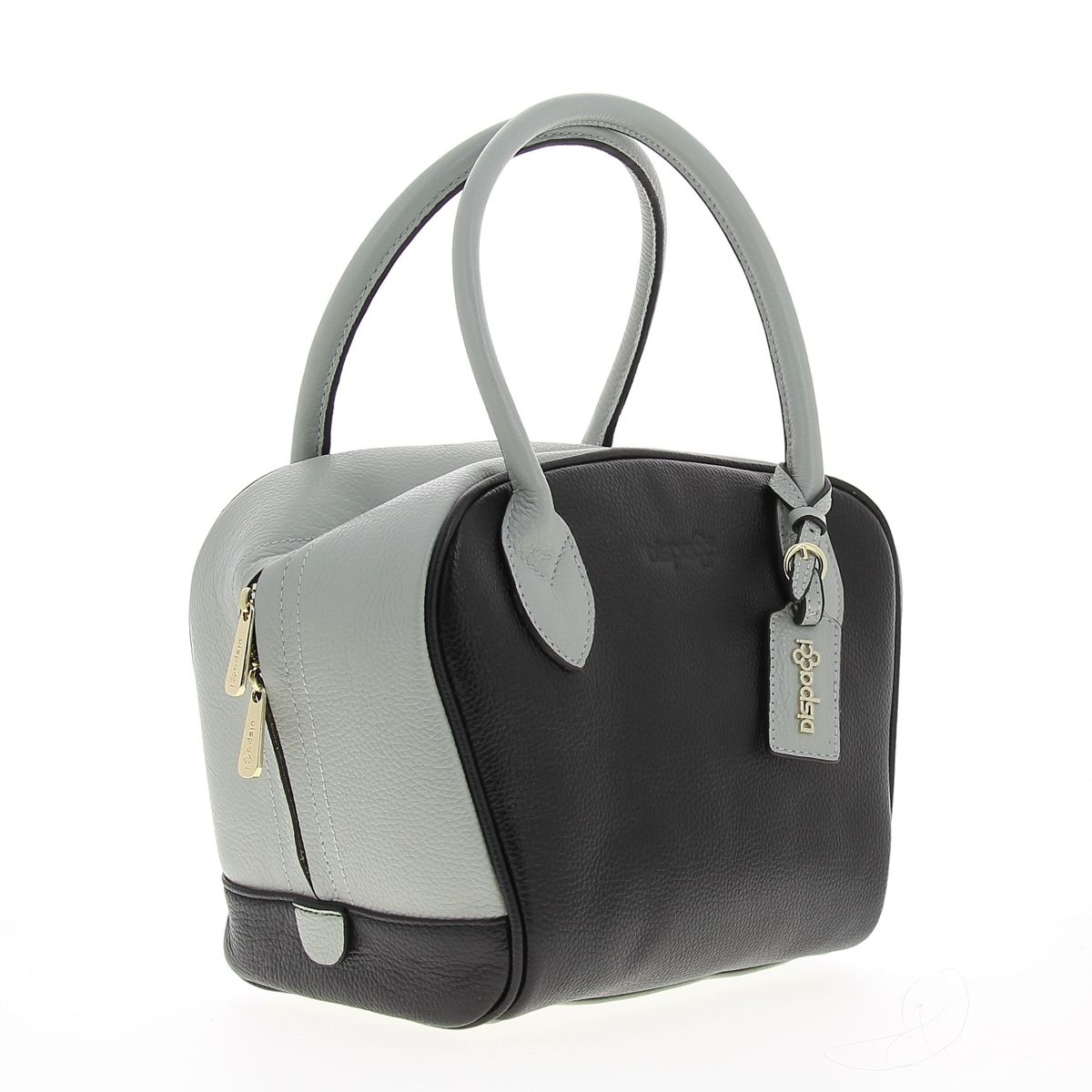Женская сумочка DISPACCI из натуральной кожи, выполнена в сочетании серого и черного цвета. Цвет фурнитуры - светлое золото. Сумка закрывается на общую металлическую молнию. Внутри имеется одно главное отделение, боковой карман на молнии, и кармашки для мобильного телефона и мелочей. На дне имеются ножки. Модель имеет две ручки. Высота ручек - 15 см. Оригинальная сумочка из мягкой кожи, прекрасно подойдет для весенне-летнего образа, а сочетании двух цветов в аксессуарах сейчас как никогда в моде! Идеальный вариант для тех кто любит удобство и стиль!