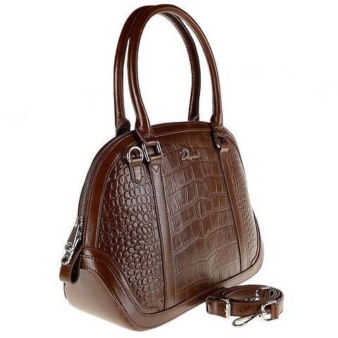 Женская сумка DISPACCI коричневого цвета. Выполнена из натуральной кожи с тиснение под рептилию. Цвет фурнитуры - серебро. Сумка закрывается на общую металлическую молнию , внутри одно большое отделение, боковой карман на молнии и кармашки для мобильного телефона и мелочей. На дне имеются ножки. Пустая сумка хорошо держит форму. Модель имеет две ручки. Высота ручек - 16 см. В комплекте имеется наплечный ремень, максимальная длина ремня 100 см. Очень красивая сумочка оригинальной формы, среднего размера, а кожа рептилии это несравненный лидер по популярности в мире сумок! Сумка прекрасно подойдет к классическому и повседневному образу, сделает ваш образ стильным и элегантным!