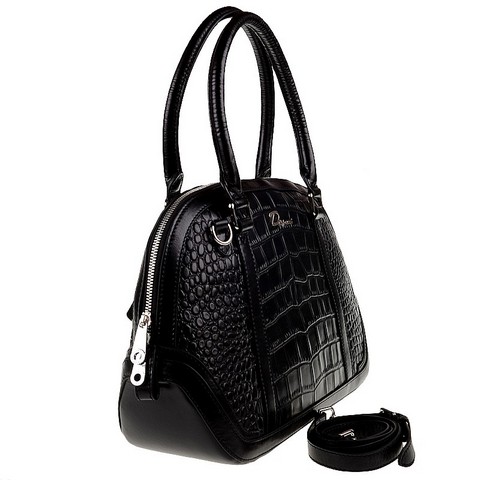 Женская сумка DISPACCI черного цвета. Выполнена из натуральной кожи с тиснение под рептилию. Цвет фурнитуры - серебро. Сумка закрывается на общую металлическую молнию , внутри одно большое отделение, боковой карман на молнии и кармашки для мобильного телефона и мелочей. На дне имеются ножки. Пустая сумка хорошо держит форму. Модель имеет две ручки. Высота ручек - 16 см. В комплекте имеется наплечный ремень, максимальная длина ремня 100 см. Очень красивая сумочка оригинальной формы, среднего размера, а кожа рептилии это несравненный лидер по популярности в мире сумок! Сумка прекрасно подойдет к классическому и повседневному образу, сделает ваш образ стильным и элегантным!