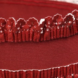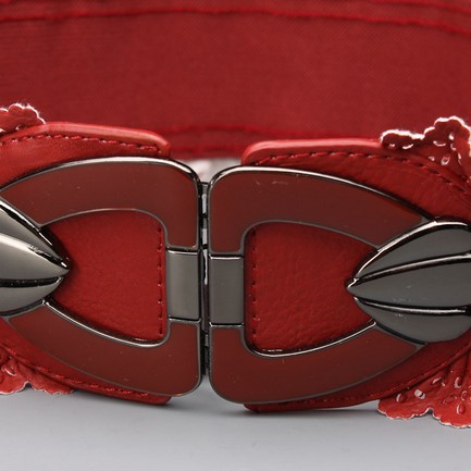 Полоса ремня выполнена из эластичной резинки. Края резинки обрамлены кружевом из искусственной кожи. Украшает ремень пряжка с эмалью.
