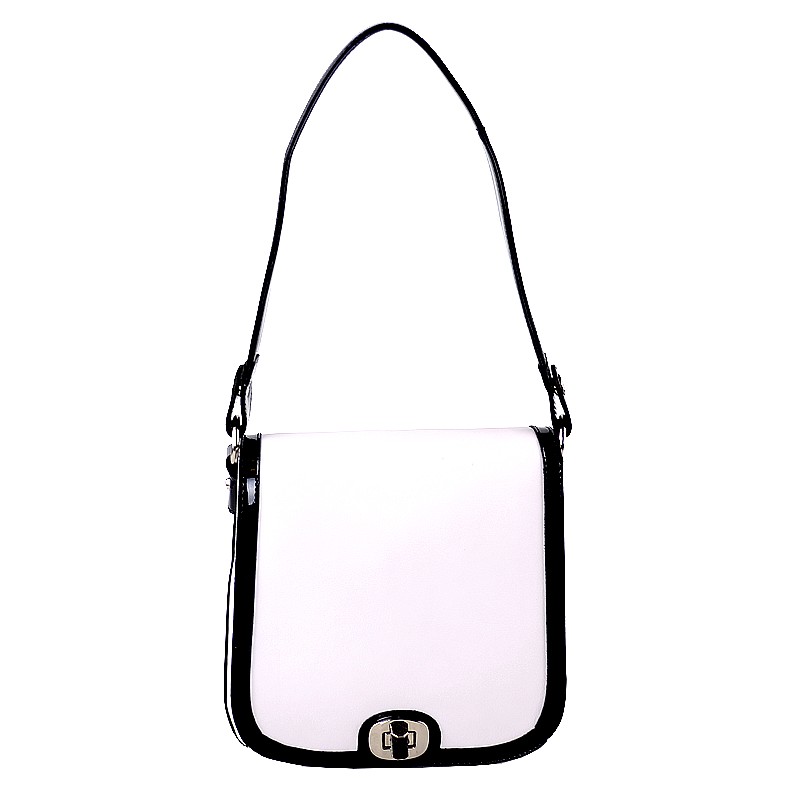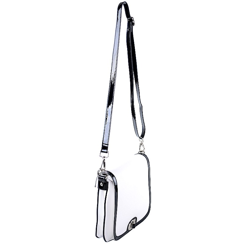 Женская сумочка Dispacci выполнена из гладкой натуральной кожи белого цвета. Отделка - лаковая натуральная кожа черного цвета. На задней стенке есть удобный кармашек на молнии. Сумка имеет 3 отделения. Два крайних отделения на металлической молнии (внутри - одно отделение, карман на молнии, открытый карман и для мобильного). Отделение по середине без молнии. Цвет фурнитуры - серебро. Модель не вмещает формат А4. Сумка держит форму. В комплекте есть два наплечных ремня.