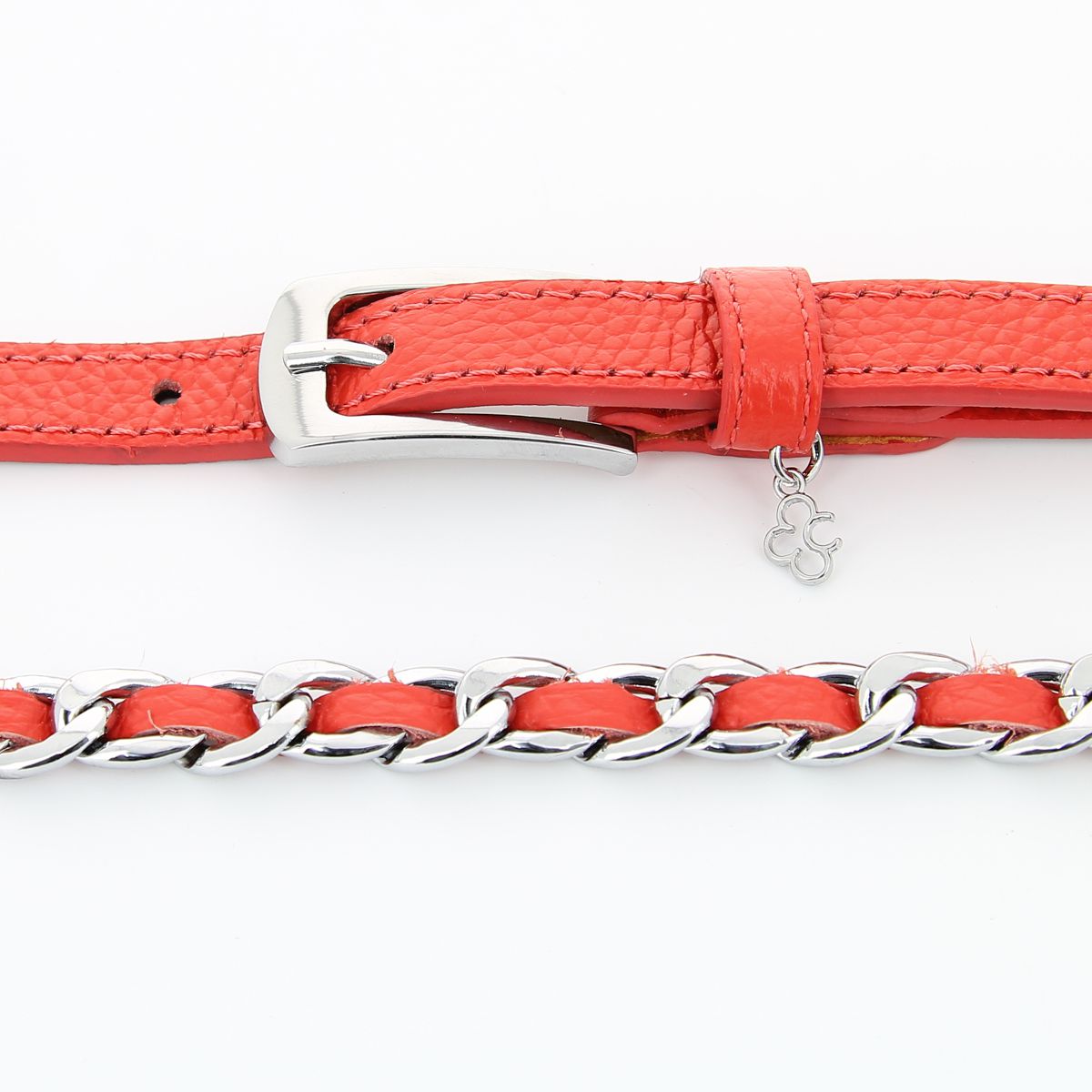 Женский ремень кораллового цвета из натуральной кожи от бренда DISPACCI. Цвет фурнитуры серебро. Размер регулируется за счет болта. В коллекции весна-лето 2014 на пике популярности сложные ремни, украшенные цепочками или металлическими вставками. Дизайнерский ремень, полоса из натуральной кожи переплетена металлической цепочкой! Отличный вариант для тех кто следит за модой. Удобный аксессуар на каждый день, и яркий акцент вашего наряда на вечер!