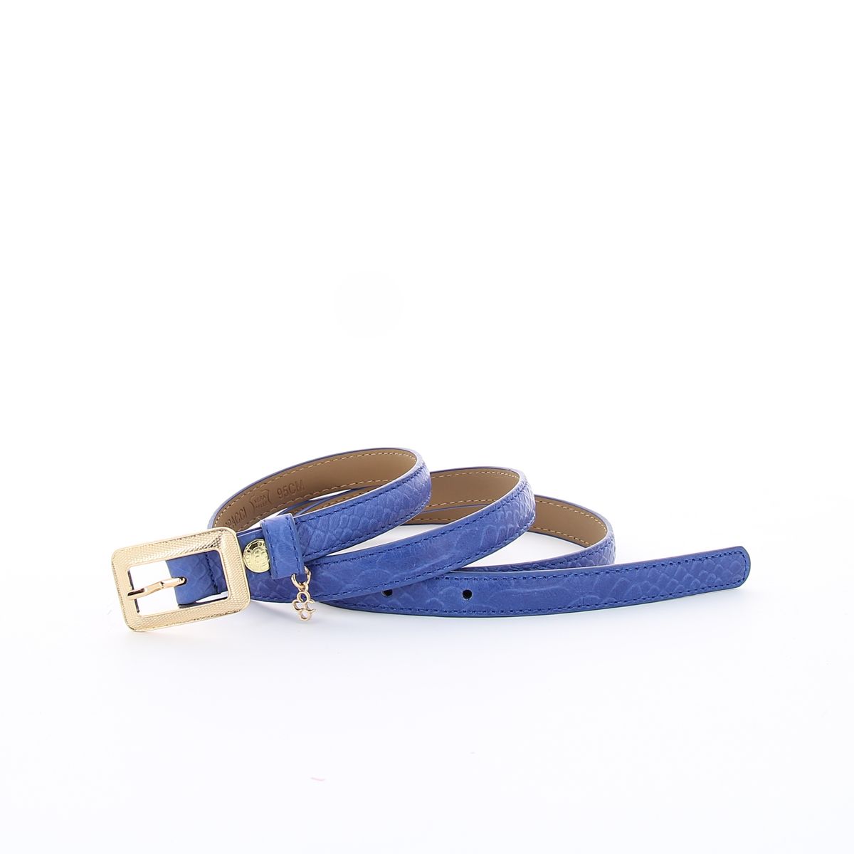 Женский ремень синего цвета из натуральной кожи. Стильные, тонкие ремни от бренда DISPACCI подчеркнут достоинства вашей фигуры, и сделают яркий акцент в вашем наряде! Размер регулируется за счет болта. Цвет фурнитуры - золото. Прямая полоса ремня с выделкой под рептилию, оригинальная дизайнерская пряжка прямоугольной формы. Такой ремешок прекрасно подойдет юбке и брюкам, а также украсит платье или тунику.
