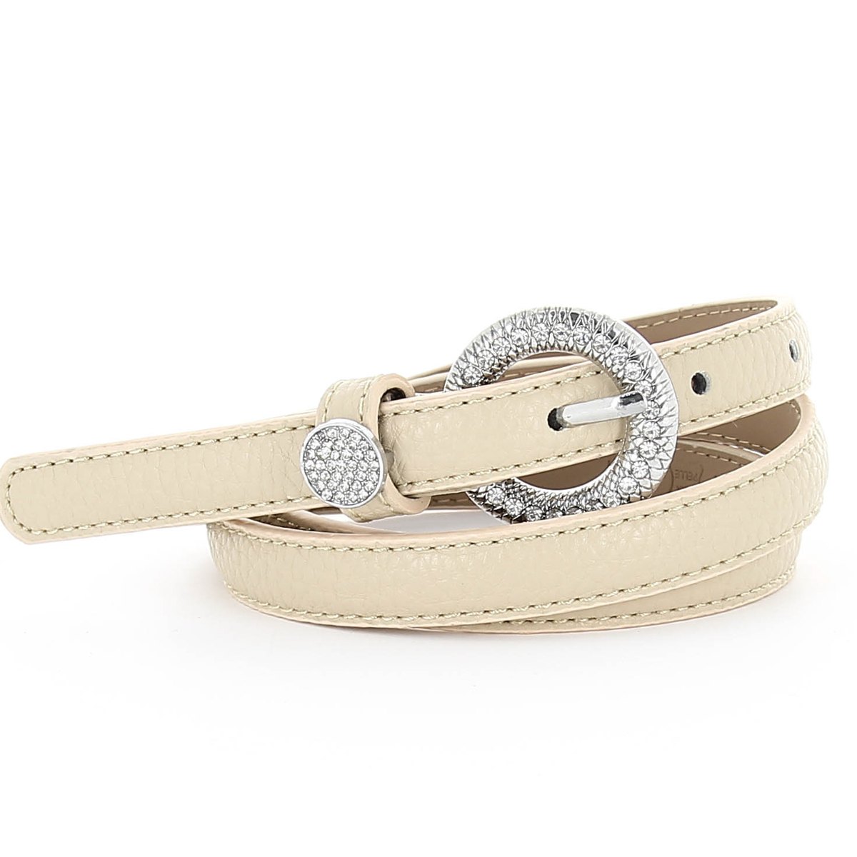 Женский ремень бежевого цвета из натуральной кожи. Стильные, тонкие ремни от бренда DISPACCI подчеркнут достоинства вашей фигуры, и сделают яркий акцент в вашем наряде! Размер регулируется за счет болта. Цвет фурнитуры - серебро. Прямую полосу ремня украшает изящная круглая пряжка, усыпанная стразами. Такой ремешок прекрасно подойдет юбке и брюкам, а также украсит платье или тунику.
