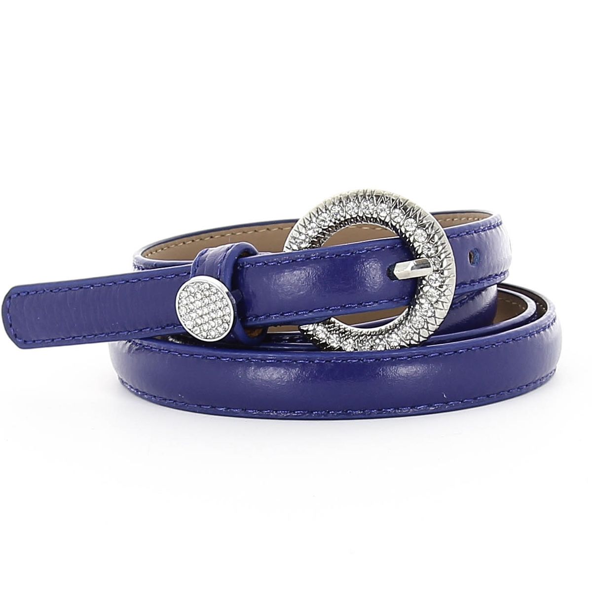 Женский ремень синего цвета из натуральной кожи. Стильные, тонкие ремни от бренда DISPACCI подчеркнут достоинства вашей фигуры, и сделают яркий акцент в вашем наряде! Размер регулируется за счет болта. Цвет фурнитуры - серебро. Прямую полосу ремня украшает изящная круглая пряжка, усыпанная стразами. Такой ремешок прекрасно подойдет юбке и брюкам, а также украсит платье или тунику.