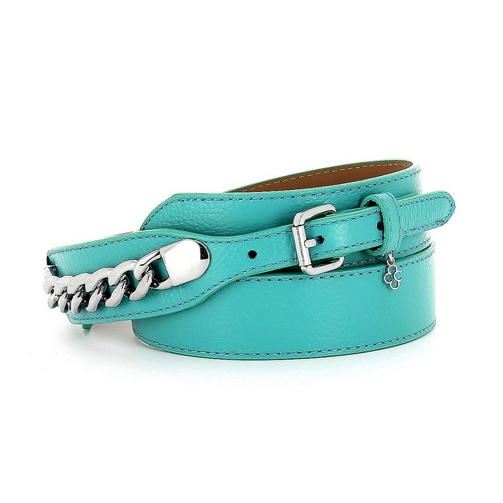 Женский ремень бирюзового цвета из натуральной кожи от бренда DISPACCI. Цвет фурнитуры - серебро. Одной из актуальных тенденций коллекции ремней весна-лето 2014 стали металлические элементы, цепочки, а также двойные ремни, с широкой основой и тонким ремешком сверху. Незаменимый аксессуар для настоящих модниц! Дизайнеры предлагают носить такой ремень с туникой или юбкой на бедрах, или с платьем на талию.