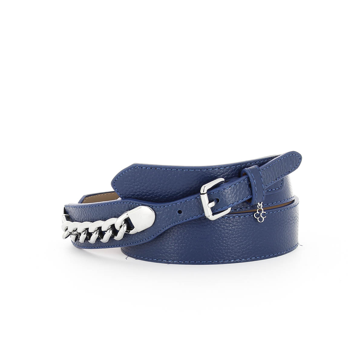 Женский ремень синего цвета из натуральной кожи от бренда DISPACCI. Цвет фурнитуры - серебро. Одной из актуальных тенденций коллекции ремней весна-лето 2014 стали металлические элементы, цепочки, а также двойные ремни, с широкой основой и тонким ремешком сверху. Незаменимый аксессуар для настоящих модниц! Дизайнеры предлагают носить такой ремень с туникой или юбкой на бедрах, или с платьем на талию.