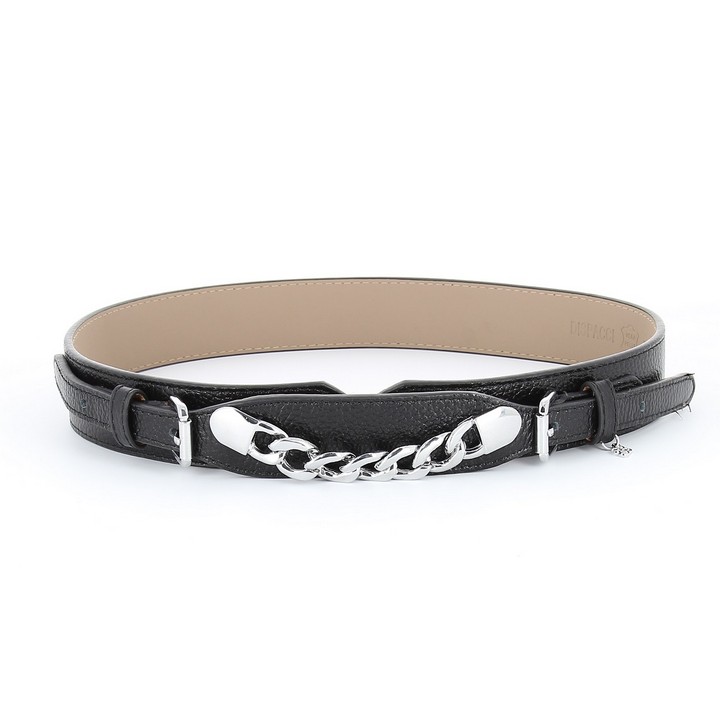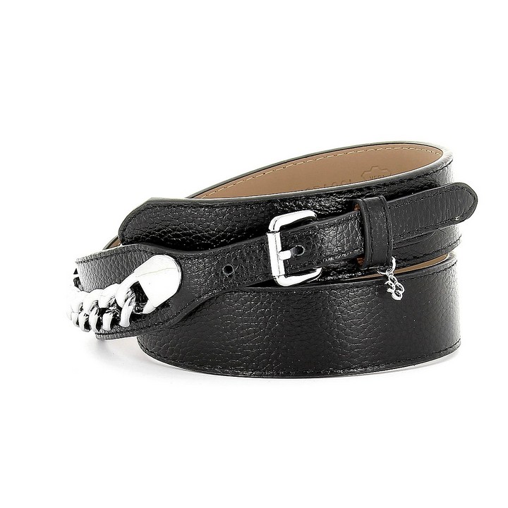 Женский ремень черного цвета из натуральной кожи от бренда DISPACCI. Цвет фурнитуры - серебро. Одной из актуальных тенденций коллекции ремней весна-лето 2014 стали металлические элементы, цепочки, а также двойные ремни, с широкой основой и тонким ремешком сверху. Незаменимый аксессуар для настоящих модниц! Дизайнеры предлагают носить такой ремень с туникой или юбкой на бедрах, или с платьем на талию.