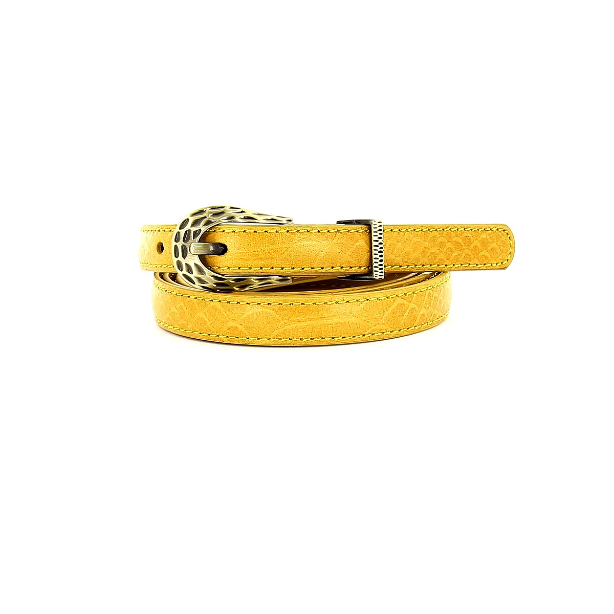 Женский ремень желтого цвета из натуральной кожи. Подчеркнуть стройность и изящество фигуры вам помогут узкие ремешки от бренда DISPACCI. Размер регулируется за счет болта. Цвет фурнитуры - черненое золото. Прямая полоса ремня с выделкой под рептилию, дизайнерская пряжка овальной формы, именно такая модель ремня сейчас на пике популярности! Стильный аксессуар для весенне-летнего образа!