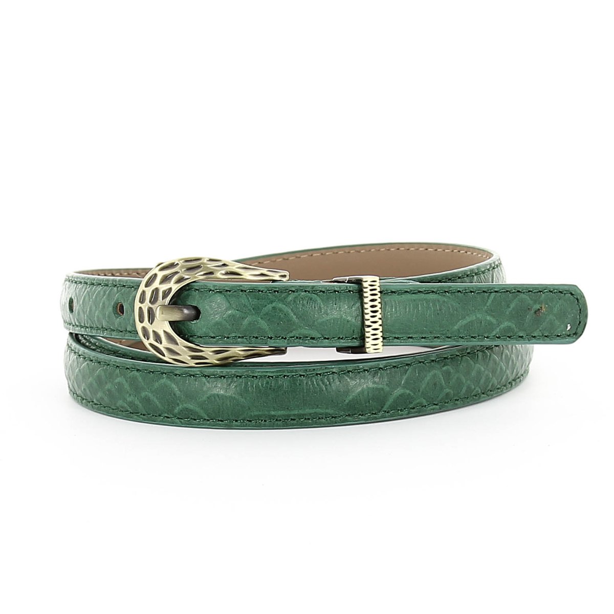 Женский ремень зеленого цвета из натуральной кожи. Подчеркнуть стройность и изящество фигуры вам помогут узкие ремешки от бренда DISPACCI. Размер регулируется за счет болта. Цвет фурнитуры - черненое золото. Прямая полоса ремня с выделкой под рептилию, дизайнерская пряжка овальной формы, именно такая модель ремня сейчас на пике популярности! Стильный аксессуар для весенне-летнего образа!