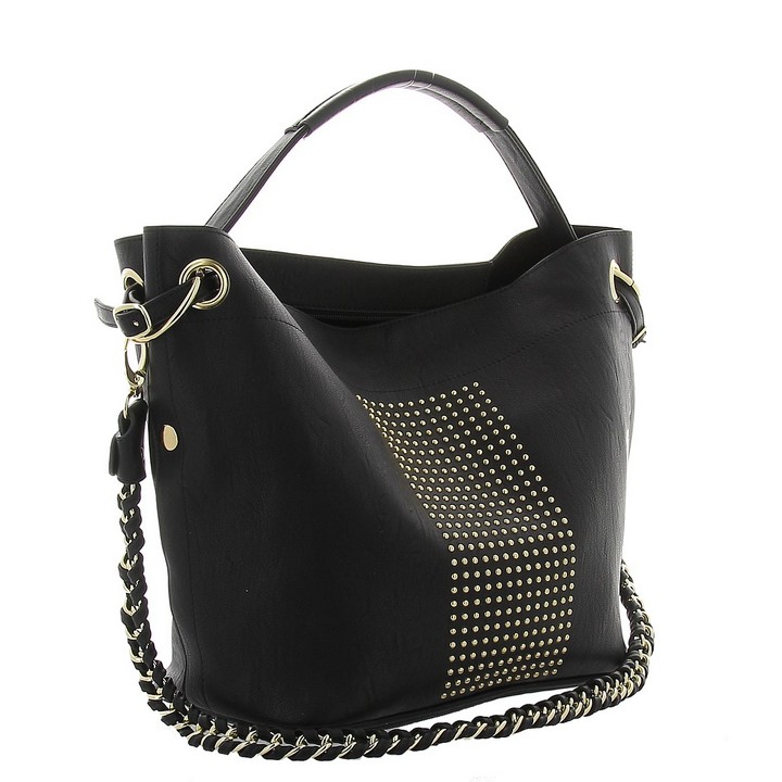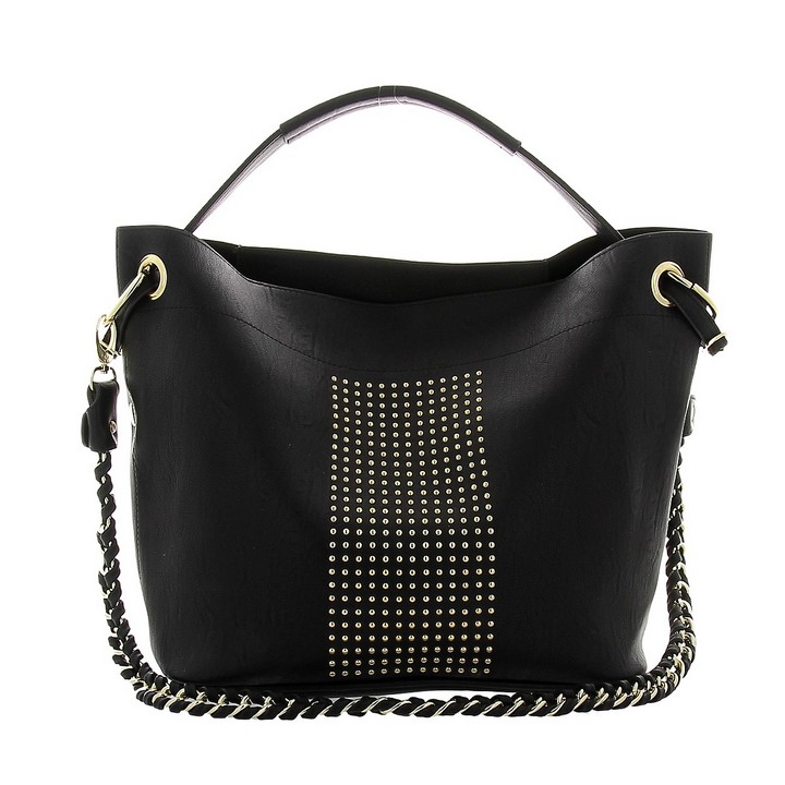 Женская сумка DISPACCI черного цвета. Выполнена из качественной эко кожи. Сумки с клепками сейчас на пике популярности! Очень стильная модель сумочки порадует как молодежь, так и взрослых! Идеальный вариант для тех кто следит за модой! Прекрасно подойдет, к классическому и повседневному образу. Цвет фурнитуры - золото. Сумка закрывается на общую металлическую молнию, имеет одно главное отделение. На дне имеются ножки. В комплекте прилагается маленькая сумочка, которая имеет боковой карман на молнии с внешней стороны, а внутри карман на молнии и кармашки для мобильного телефона и мелочей. Модель имеет одну ручку. Высота ручки - 14 см. Прилагается наплечный ремень интересного дизайна - цепочка с переплетением кожи, длина ремня 70 см.
