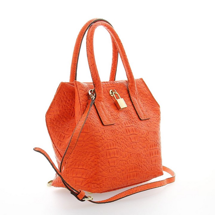 Женская сумочка DISPACCI оранжевого цвета. Сумочки под кожу крокодила сейчас на пике популярности, а особенно в ярких цветах! Миниатюрная сумочка порадует каждую девушку, прекрасно подойдет для делового стиля, и повседневного образа! Сумка закрывается на кнопку. Внутри имеется одно главное отделение, боковой карман на молнии, и кармашки для мобильного телефона и мелочей. На дне имеются ножки. Цвет фурнитуры - светлое золото. Модель имеет две ручки, высота 12 см. Прилагается наплечный ремень, максимальная длина 110 см.