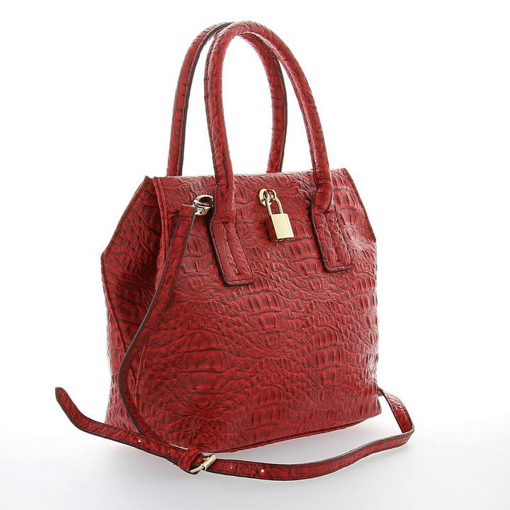 Женская сумочка DISPACCI красного цвета. Сумочки под кожу крокодила сейчас на пике популярности, а особенно в ярких цветах! Миниатюрная сумочка порадует каждую девушку, прекрасно подойдет для делового стиля, и повседневного образа! Сумка закрывается на кнопку. Внутри имеется одно главное отделение, боковой карман на молнии, и кармашки для мобильного телефона и мелочей. На дне имеются ножки. Цвет фурнитуры - светлое золото. Модель имеет две ручки, высота 12 см. Прилагается наплечный ремень, максимальная длина 110 см.