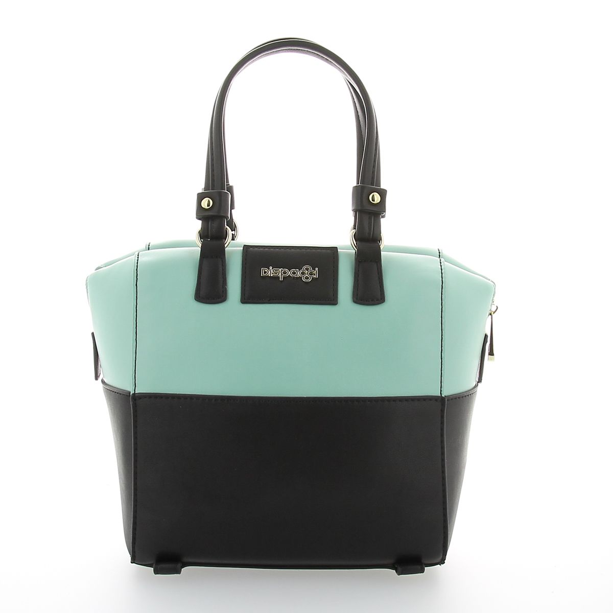 Женская сумочка DISPACCI выполнена в сочетании светло-бирюзового и черного цвета. Классическая пухленькая сумочка, выполненная в двух цветах, станет самым модным аксессуаром на сезон весна лето 2014! Дизайнеры предлагают сочетать их с классическим и повседневным образом! Сумка с внешней стороны закрывается на общую металлическую молнию, а также имеет боковой карман на молнии. Внутри имеется одно главное отделение, боковой карман на молнии, и кармашки для мобильного телефона и мелочей. На дне имеются ножки. Цвет фурнитуры - светлое золото. Модель имеет две ручки, высота 12 см. Прилагается наплечный ремень, максимальная длина 110 см.