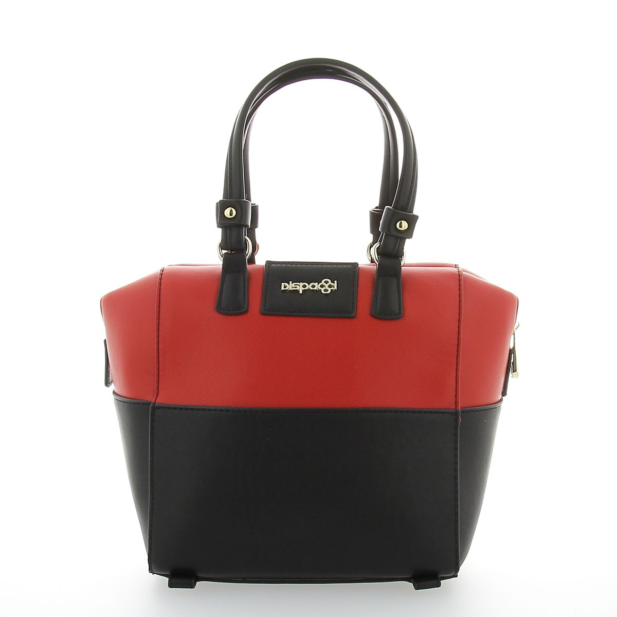 Женская сумочка DISPACCI выполнена в сочетании красного и черного цвета. Классическая пухленькая сумочка, выполненная в двух цветах, станет самым модным аксессуаром на сезон весна лето 2014! Дизайнеры предлагают сочетать их с классическим и повседневным образом! Сумка с внешней стороны закрывается на общую металлическую молнию, а также имеет боковой карман на молнии. Внутри имеется одно главное отделение, боковой карман на молнии, и кармашки для мобильного телефона и мелочей. На дне имеются ножки. Цвет фурнитуры - светлое золото. Модель имеет две ручки, высота 12 см. Прилагается наплечный ремень, максимальная длина 110 см.