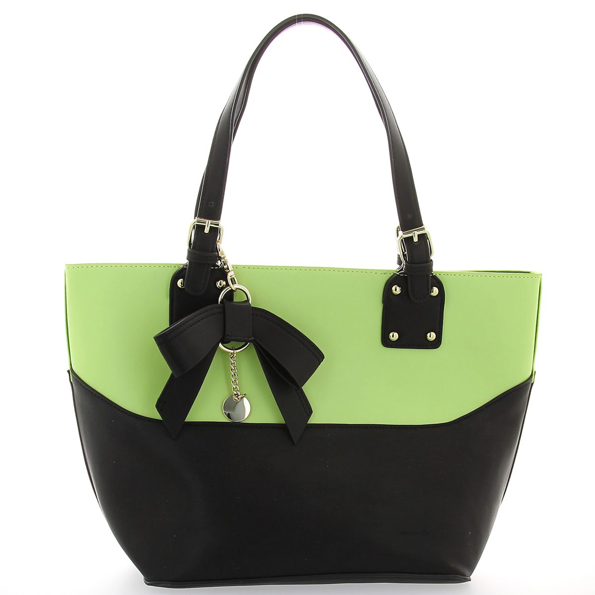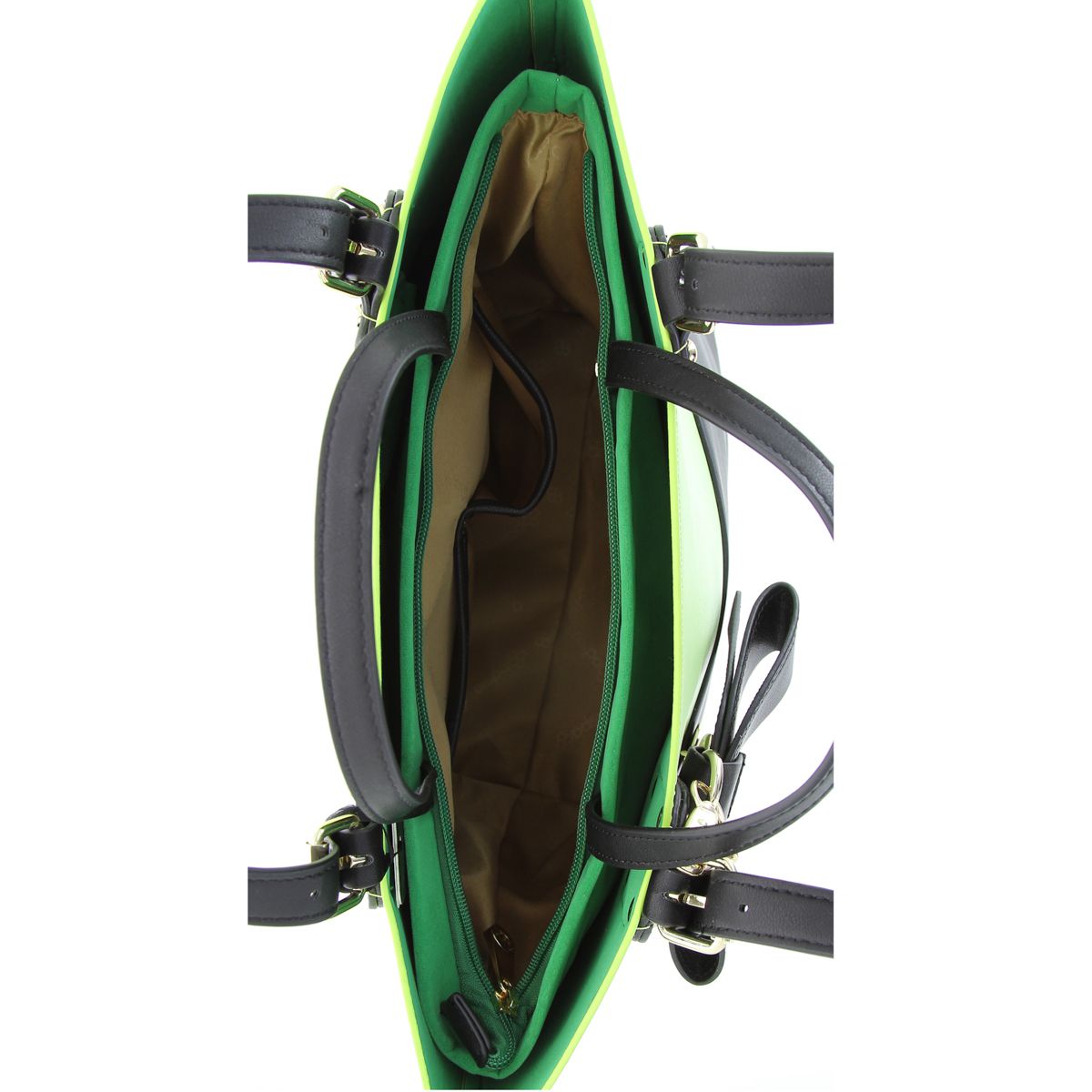 Женская сумочка DISPACCI выполнена в сочетании светло-зеленого и черного цвета. На сезон весна-лето 2014 очень популярны будут сумочки в форме трапеции! Дизайнеры не перестают удивлять нас своими новыми идеями! Две сумки в одной! Прекрасный вариант для тех кто любит удобство и стиль. С внешней стороны сумочка имеет боковой карман на молнии. Внутри сумки еще одна сумка, которая застегивается на общую металлическую молнию, и имеет боковой карман на молнии, и кармашки для мобильного телефона и мелочей. У главной сумочки на дне имеются ножки. Цвет фурнитуры - светлое золото. Модель имеет две ручки, высота 20 см.