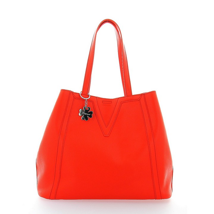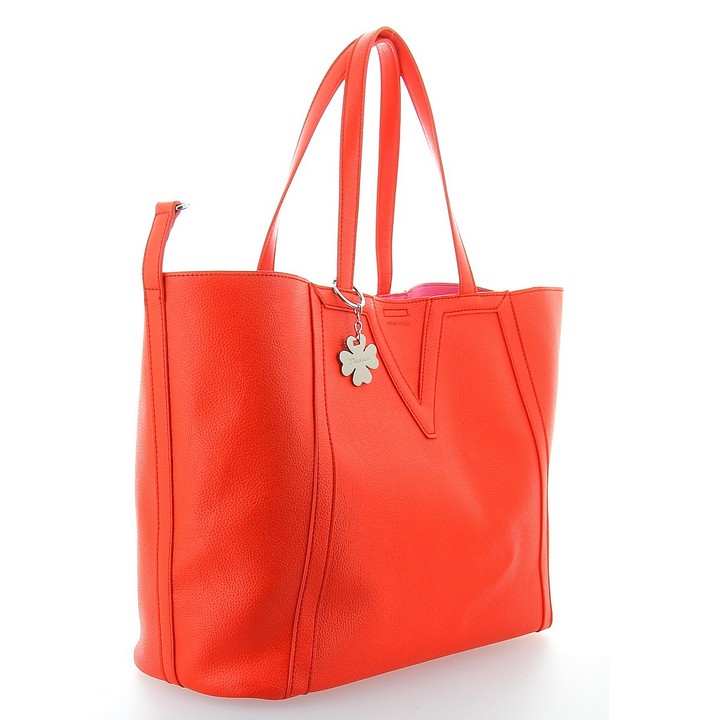 Женская сумочка DISPACCI кораллового цвета. На сезон весна-лето 2014 очень популярны будут сумочки в форме трапеции и минимализм в отделке. Сама сумочка выполнена из мягкой высококачественной эко кожи, за счет креплений у основания сумки, может менять форму. Дизайнеры не перестают удивлять нас своими новыми идеями! Две сумки в одной! Прекрасный вариант для тех кто любит удобство и стиль. Внутри сумки еще одна сумка золотого цвета, которая застегивается на общую металлическую молнию, и имеет боковой карман на молнии, и кармашки для мобильного телефона и мелочей, также к ней прилагается наплечный ремень, максимальная длина 110 см. Цвет фурнитуры - серебро. Модель имеет две ручки, высота 20 см.