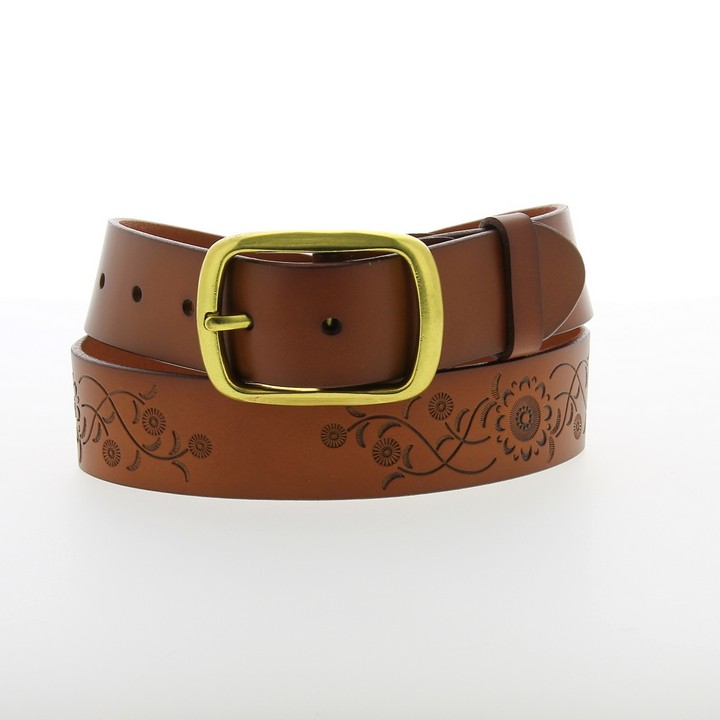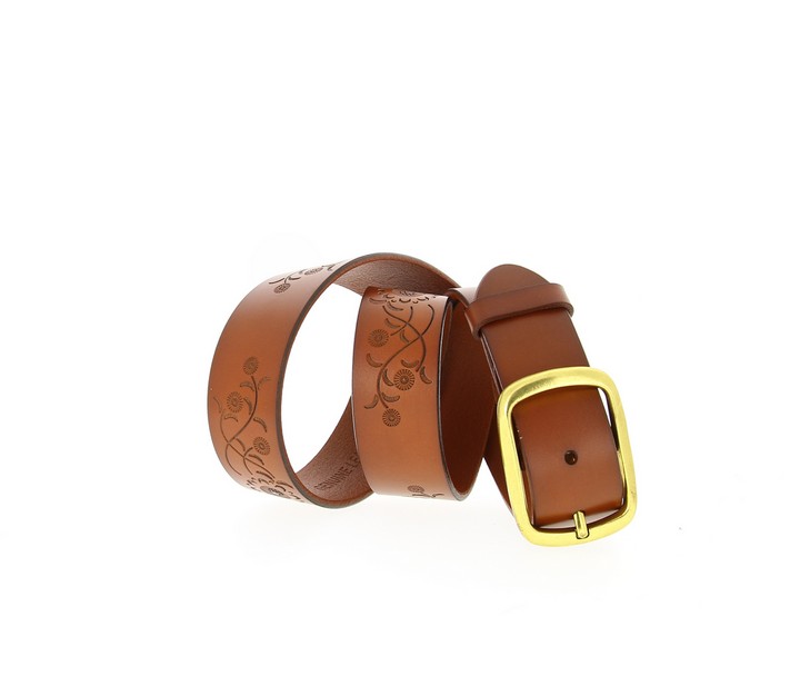 Женский ремень цвета кэмл от бренда DISPACCI. Дизайнерский ремень в стиле casual. Классическая пряжка, гладкая, прямая полоса ремня из натуральной высококачественной кожи с цветочным орнаментом. Размер регулируется за счет болта. Цвет фурнитуры - черненое золото. Ремень невероятно модный аксессуар на сезон весна-лето 2014! Сделать модный акцент в своем образе не сложно, просто одевая этот ремень в брюки или джинсы!