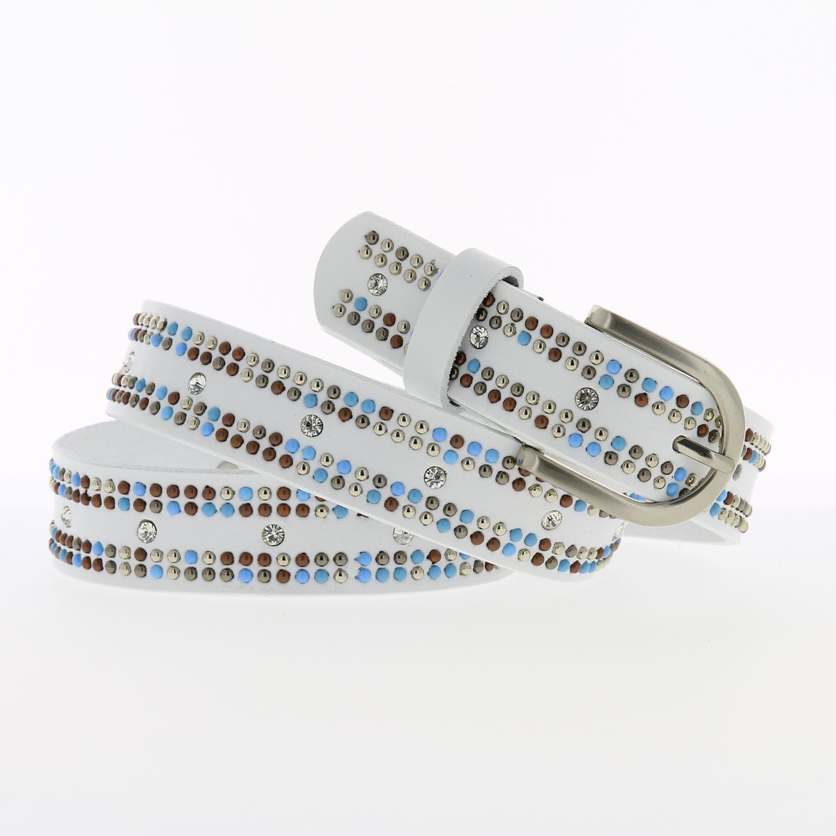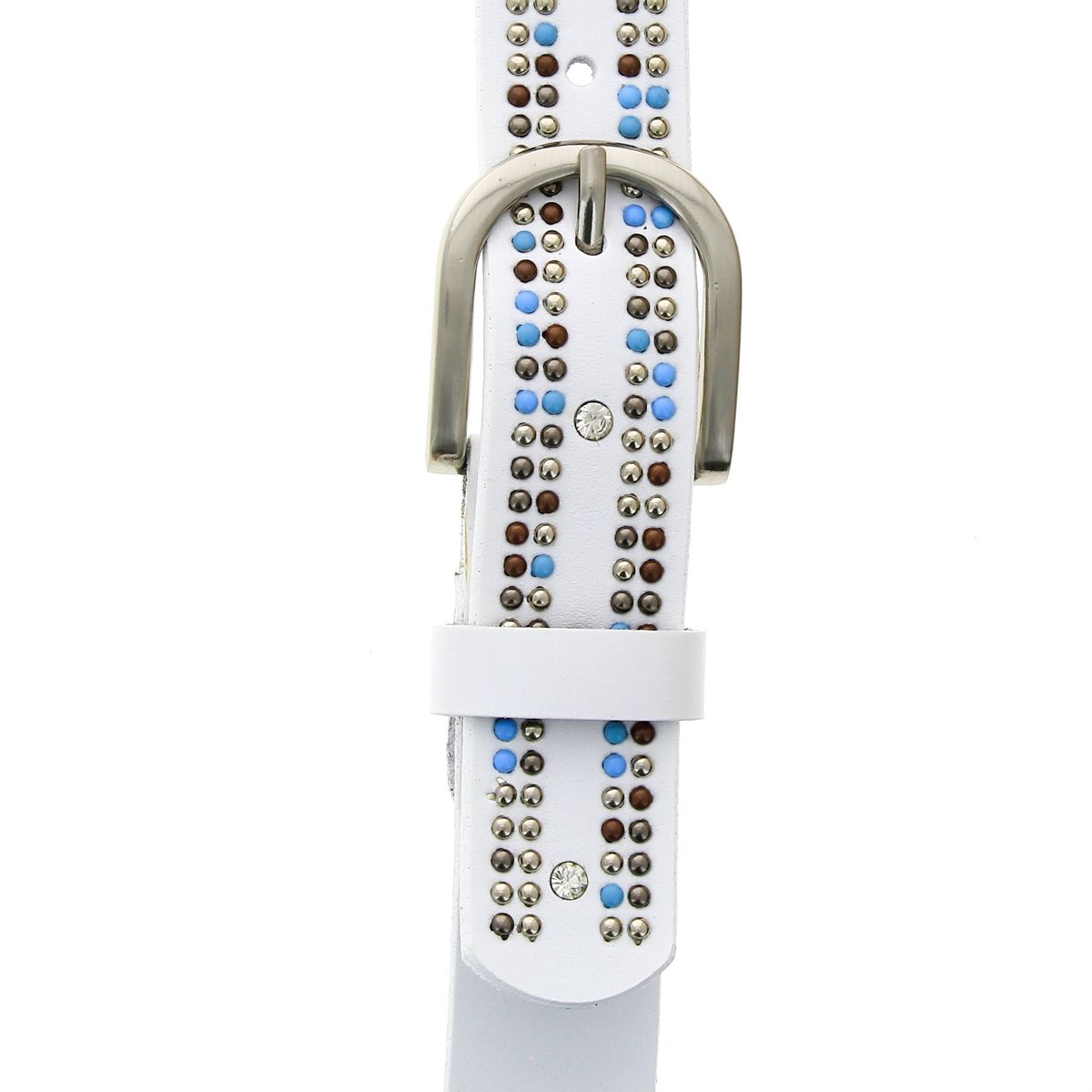 Женский ремень белого цвета от бренда DISPACCI. Дизайнерский ремень в стиле casual. Гладкая, прямая полоса ремня из натуральной высококачественной кожи, усыпанная стразами, клепками и бусинками. Размер регулируется за счет болта. Цвет фурнитуры - черненое серебро. Ремень невероятно модный аксессуар на сезон весна-лето 2014! Такой ремень найдет достойное место в гардеробе каждой девушки! Прекрасно подойдет к брюкам и джинсам, а также украсит платье или тунику!