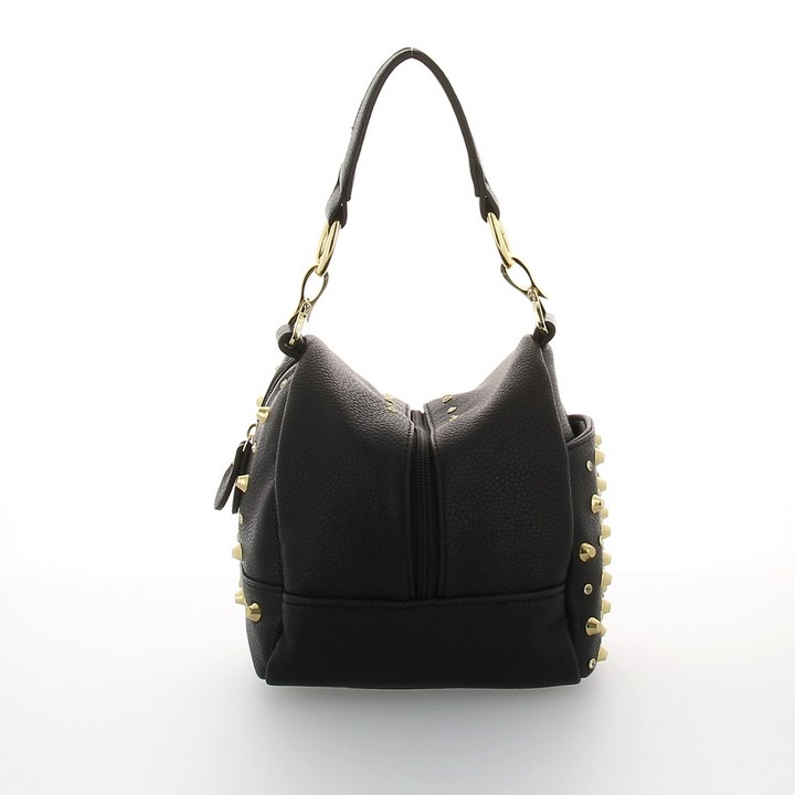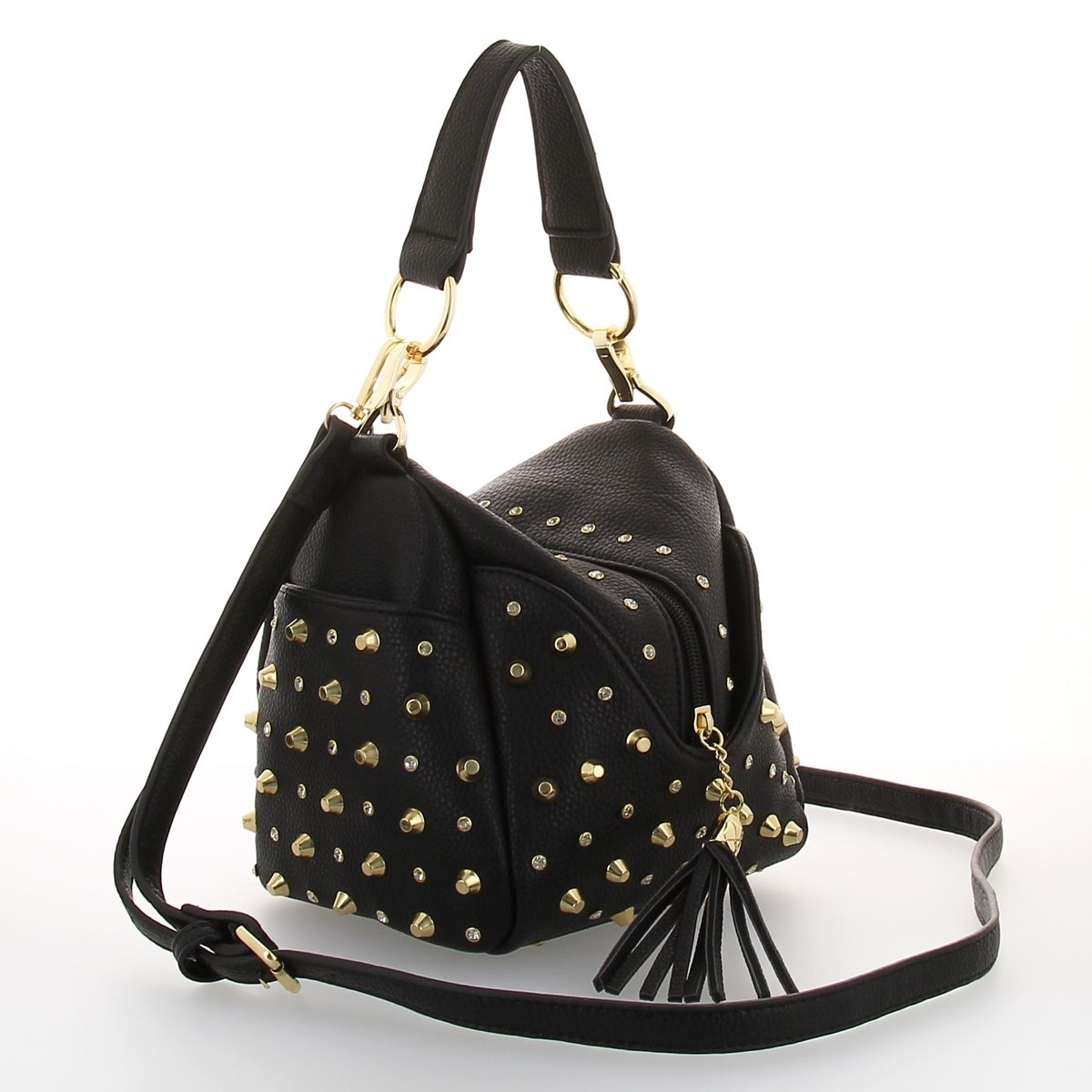 Женская сумочка DISPACCI черного цвета. Мягкие сумочки усыпанные стразами и клепками актуальный тренд сезона весна лето 2014! Такая дизайнерская сумочка так и притягивает к себе взгляды окружающих! Незаменимый аксессуар для активных девушек, которые ценят стиль! Сумочка закрывается на молнию, внутри имеет одно отделение. Фурнитура золотого цвета на всем изделии. Модель имеет одну съемную ручку, высота 15 см и наплечный ремень, максимальная длина 110 см.