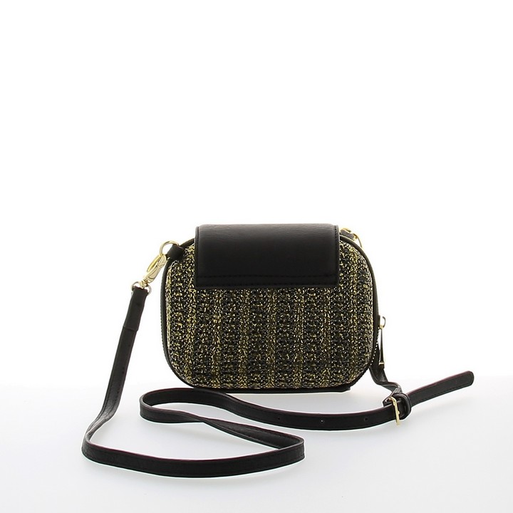 Женская сумочка DISPACCI черного цвета. Сумочка минодьер - маленькая жестяная коробочка, особенно популярна в грядущем весенне-летнем сезоне 2014! Данная модель выполнена из высококачественной эко кожи, с вставками из соломы с элементами серебра. Прекрасно подойдет для города, и сделает ваш образ стильным. Сумка закрывается на общий клапан с дизайнерским замком и металлическую молнию. Внутри сумочки имеется одно главное отделение и боковой карман. Цвет фурнитуры - золото. Прилагается наплечный ремень, максимальная длина 110 см.