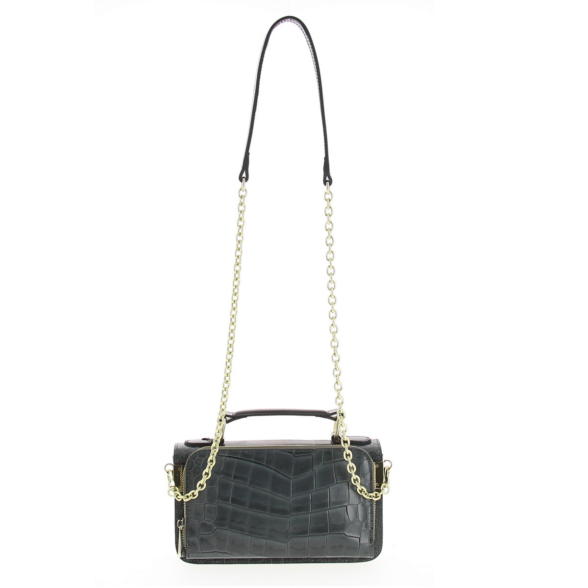 Женская сумочка DISPACCI из натуральной кожи черного цвета. Цвет фурнитуры - светлое золото. Сумка закрывается на общий клапан с дизайнерским замком. С внешней стороны сумки имеется боковой карман на молнии, выполнен в виде кошелька. Внутри имеется одно главное отделение и боковой кармашек на молнии. Модель имеет ручку, длин 6 см. Прилагается длинный ремень-цепочка с кожаной вставкой на плечо. Максимальная длина ремня 110 см. Милые изящные миниатюрные сумочки с короткими ручками и на длинном ремне, подойдут изысканным любительницам прогулок налегке! А выделка кожи под рептилию в сочетании с яркими цветами сейчас на пике популярности!