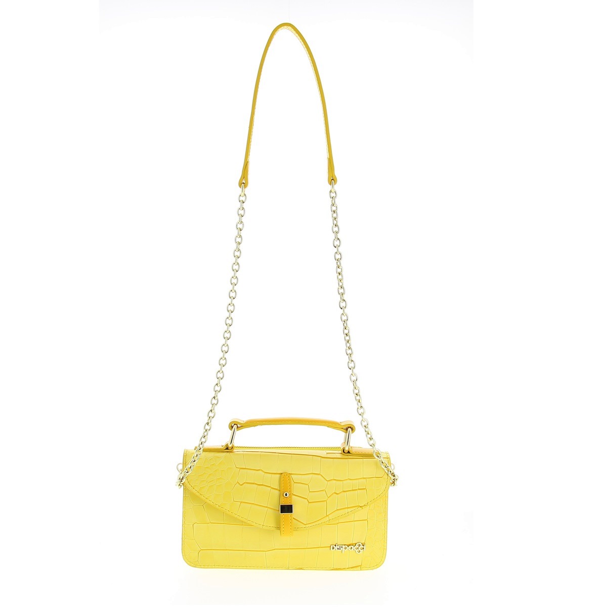 Женская сумочка DISPACCI из натуральной кожи желтого цвета. Цвет фурнитуры - светлое золото. Сумка закрывается на общий клапан с дизайнерским замком. С внешней стороны сумки имеется боковой карман на молнии, выполнен в виде кошелька. Внутри имеется одно главное отделение и боковой кармашек на молнии. Модель имеет ручку, длин 6 см. Прилагается длинный ремень-цепочка с кожаной вставкой на плечо. Максимальная длина ремня 110 см. Милые изящные миниатюрные сумочки с короткими ручками и на длинном ремне, подойдут изысканным любительницам прогулок налегке! А выделка кожи под рептилию в сочетании с яркими цветами сейчас на пике популярности!