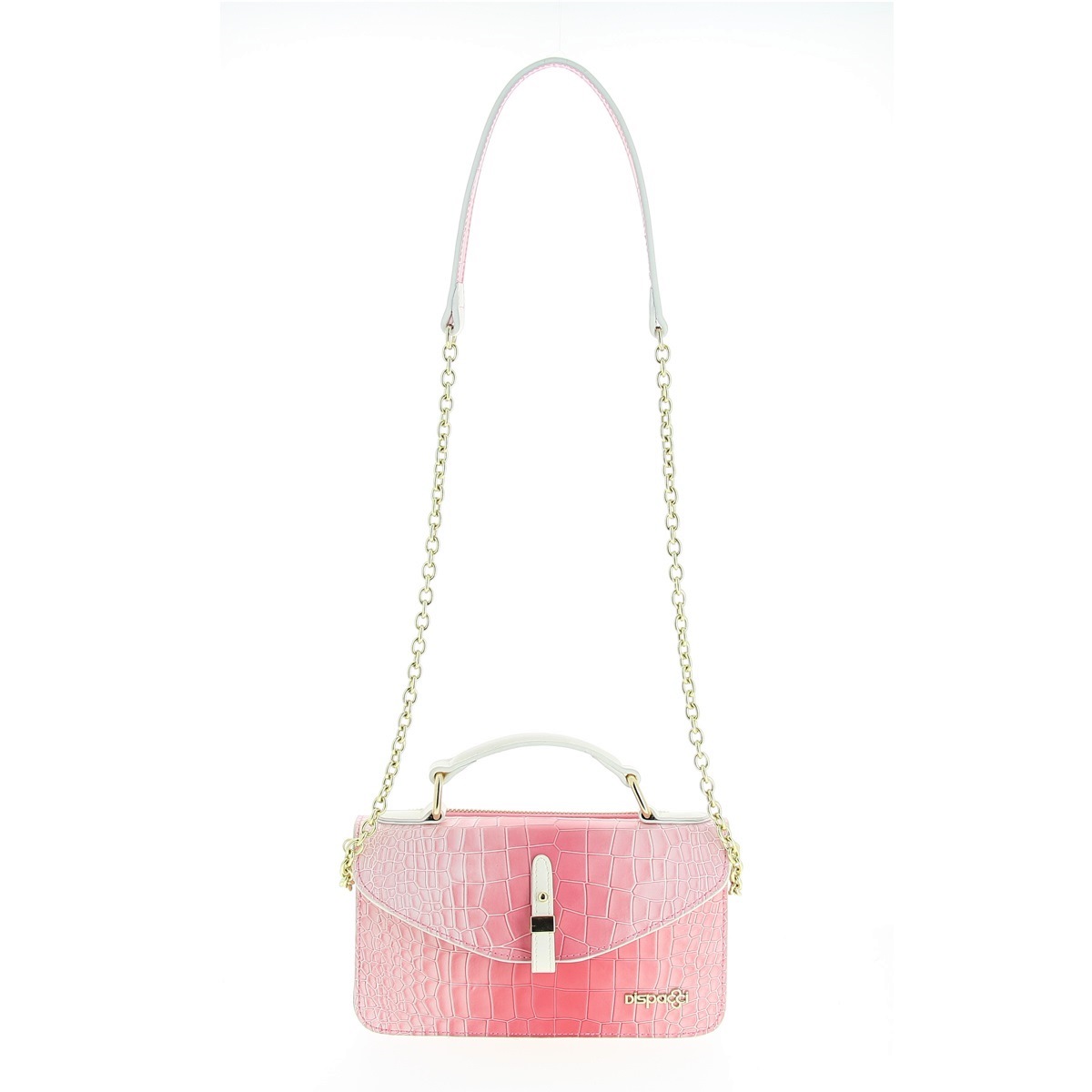 Женская сумочка DISPACCI из натуральной кожи розового цвета. Цвет фурнитуры - светлое золото. Сумка закрывается на общий клапан с дизайнерским замком. С внешней стороны сумки имеется боковой карман на молнии, выполнен в виде кошелька. Внутри имеется одно главное отделение и боковой кармашек на молнии. Модель имеет ручку, длин 6 см. Прилагается длинный ремень-цепочка с кожаной вставкой на плечо. Максимальная длина ремня 110 см. Милые изящные миниатюрные сумочки с короткими ручками и на длинном ремне, подойдут изысканным любительницам прогулок налегке! А выделка кожи под рептилию в сочетании с яркими цветами сейчас на пике популярности!