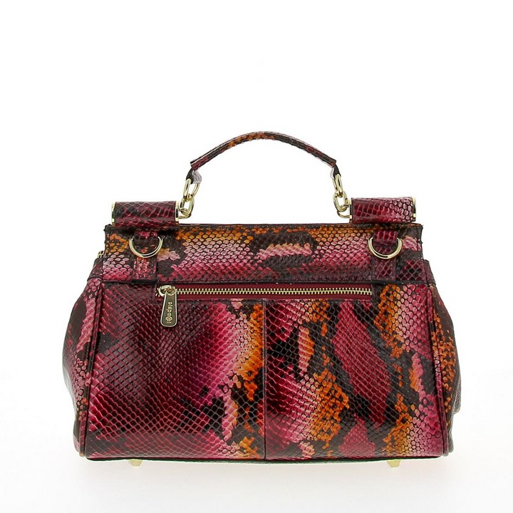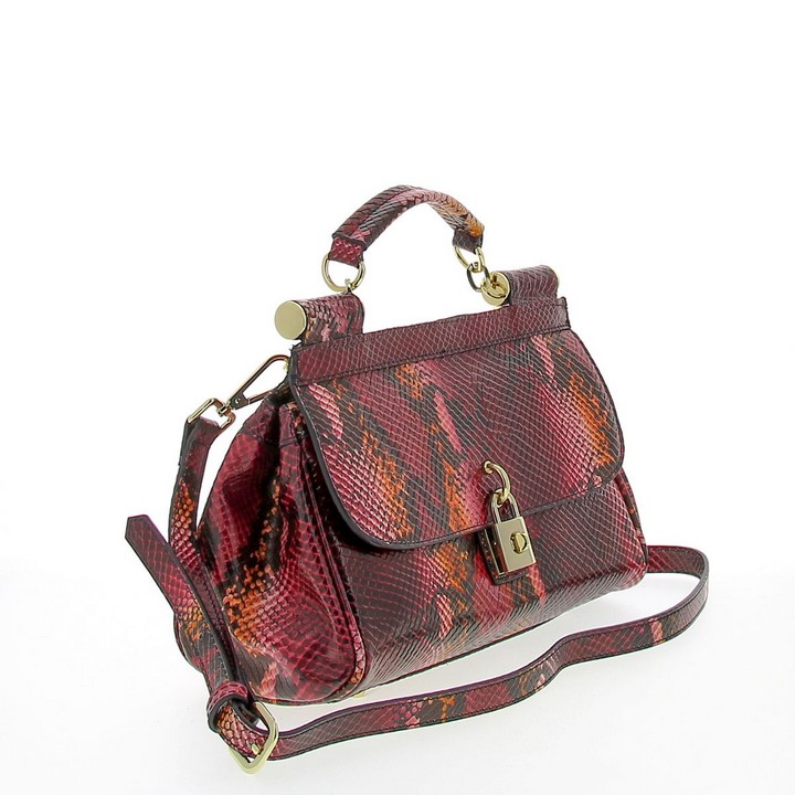 Женская сумочка DISPACCI из натуральной кожи бордового цвета. Потрясающая сумочка-саквояж из мягкой кожи с тиснением под питона, не оставит равнодушной ни одну девушку, тем более что эта модель тренд сезона весна лето 2014! Сделает ваш образ стильным и элегантным. Такая сумка станет надежной спутницей как на прогулку , так и на деловые встречи. Сумка закрывается на общий клапан с дизайнерским замком и металлическую молнию. С внешней стороны сумка имеет боковой карман на молнии, внутри два отделения разделенных средником на молнии, также имеется боковой карман на молнии, и кармашки для мобильного телефона и мелочей. Цвет фурнитуры - светлое золото. На дне имеются ножки. Модель имеет одну ручку, высота 10 см. Также прилагается длинный ремень, максимальная длина 100 см.