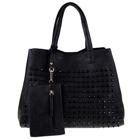 Женская сумка DISPACCI черного цвета. Выполнена из качественной эко кожи. Цвет фурнитуры - золото. Сумка закрывается за счет кнопки, имеет одно главное отделение. В комплекте прилагается маленькая сумочка и кошелек на молнии, маленькая сумочка внутри имеет карман на молнии и кармашки для мобильного телефона и мелочей, а также к ней прилагается наплечный ремень, максимальная длина ремня 105 см. Модель имеет две ручки. Высота ручки - 18 см, что позволяет носить сумку на плече. Шипованные сумки играют доминирующую роль в моде сезона 2013-2014! С такой сумкой можно пойти на работу, в ресторан или просто на прогулку! Идеальный вариант для тех кто следит за модой! Прекрасно подойдет, к классическому и повседневному образу.