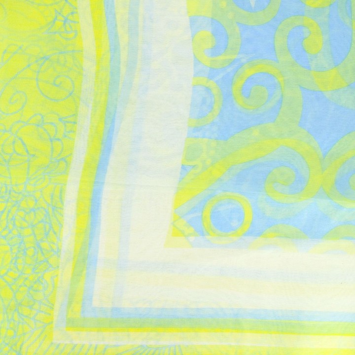 Палантин женский желтого цвета от бренда DISPACCI. Выполнен из натурального высококачественного шелка. Обработка края - машинная подгибка. Принт выполнен в нежно-голубом и желтом цвете с замысловатыми узорами и линиями, а пастельные оттенки очень актуальны в этом сезоне весна-лето 2014. Палантин из шелка это универсальный аксессуар, вы можете носить его на шее или накинуть на плечи, а также размер палантина позволят носить его как парэо на пляж.