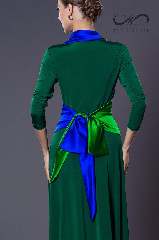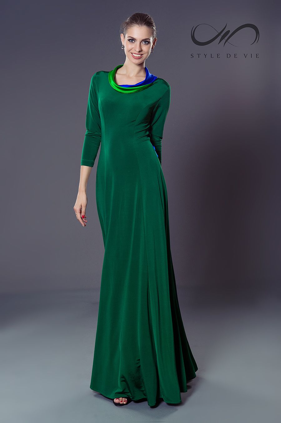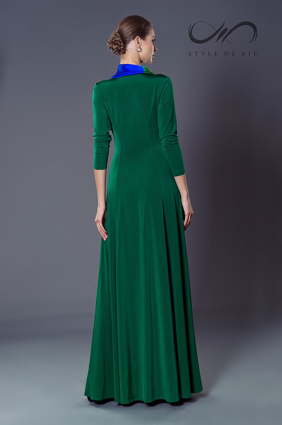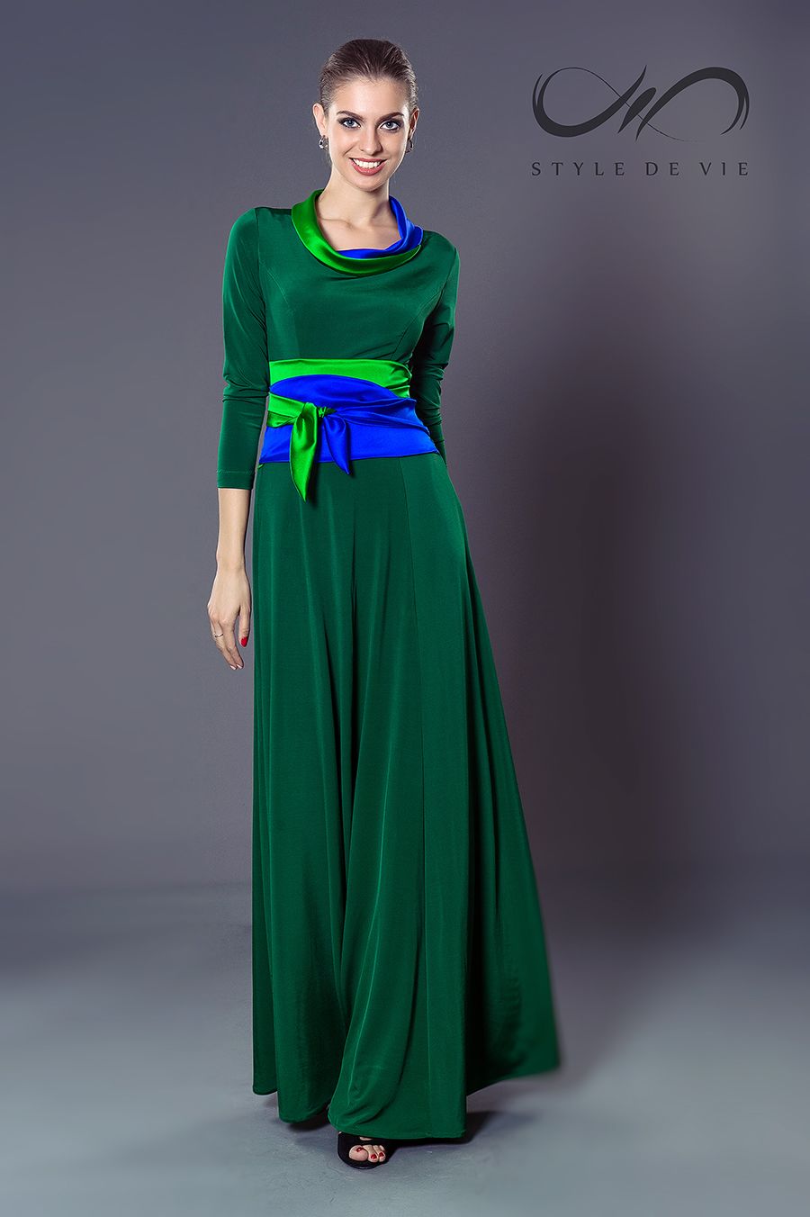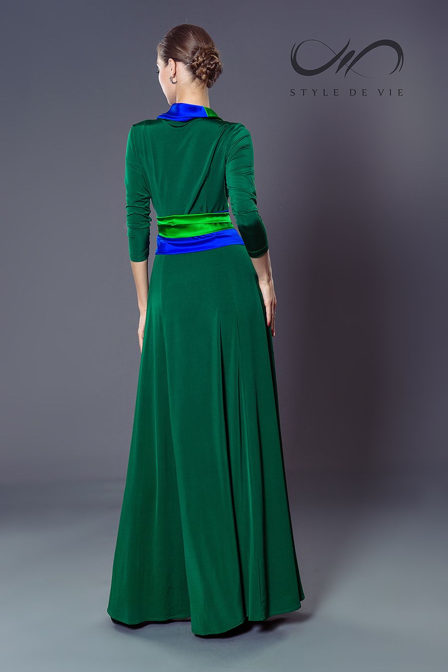 Стильное тёмно-зеленое платье с рукавами 3/4, шёлковым двуцветным поясом и оригиналным воротом отлично сидит на фигуре и подчёркивает все её достоинства! Оригинальное сочетание тканей придаёт ему особый шарм. Комфортная, элегантная модель выполнена из натуральной, эластичной, маломнущейся ткани. Пояс можно завязывать разными способами.