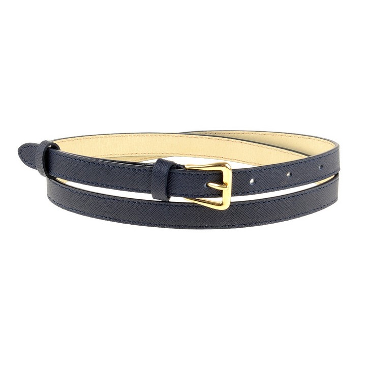 Женский ремень синего цвета от бренда DISPACCI, выполнен из натуральной итальянской высококачественной кожи. Прямая полоса ремня с новой оригинальной выделкой quot;safianoquot;. Подчеркнуть стройность и изящество фигуры вам помогут узкие ремешки, а яркие летние цвета сделают модный акцент вашего наряда! Цвет фурнитуры золото. Размер регулируется за счет болта.