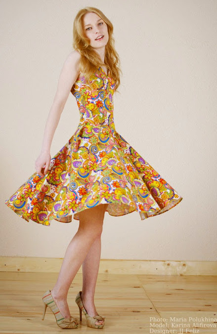 Яркое платье из хлопка с цветочным принтом. Заниженная линия талии, пышная юбка, V-образный вырез.