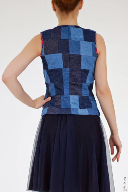 Двубортный жилет из джинсовой ткани пэчворк, отделка - клетчатая шерсть. Затегивается на металлическую молнию, на подкладке.
