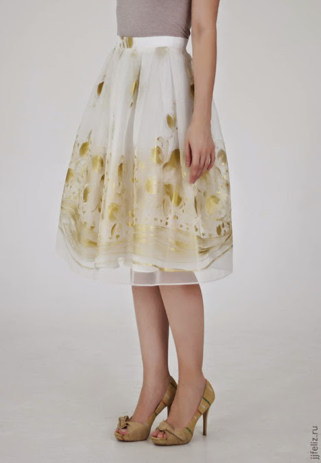 Пышная юбка в складку, сшита из шелковой органзы ungaro с золотым напылением. Дублирована шелком цвета слоновой кости. Покрытие не стирается и не смазывается, хорошо переносит утюжку.