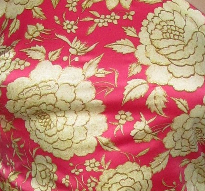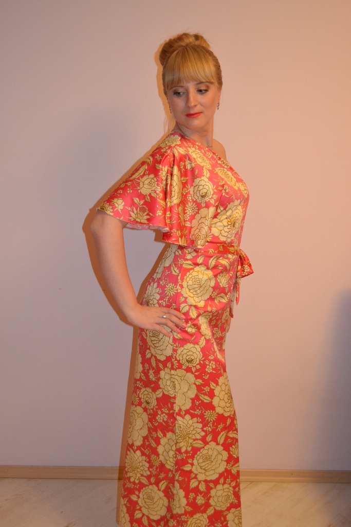 Длинное нежное платье из розового шелка с цветочным орнаментом в золотом обрамлении из ткани знаменитого бренда "Roberto Cavalli".