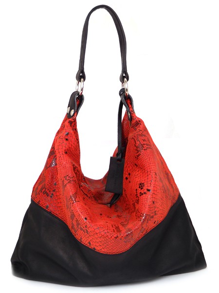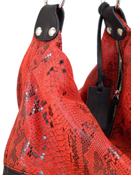 Сумка женская кожаная с принтом под красного питона. Сумка мягкая, среднего размера, удобно ложится на плечо. Основной акцент на принт под питона красного цвета.