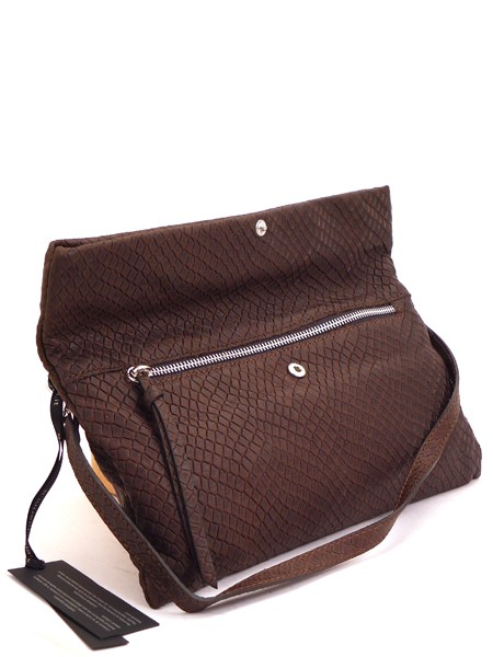 Клатч-книжка из натуральной кожи темно-коричневого цвета с фактурой под рептилию. Клатч складывается как книжка, спереди - кармана на молнии. Есть длинный ремешок.Закрывается на магнитную кнопку