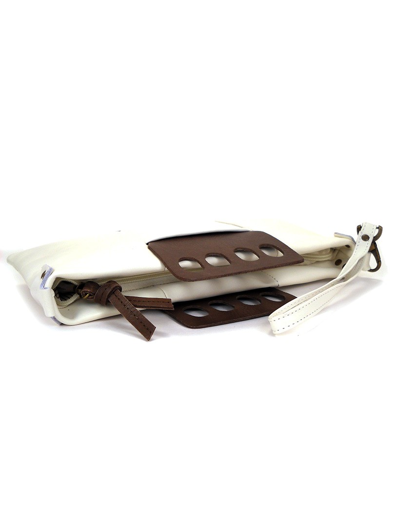 Клатч из натуральной кожи молочного цвета. Ручки - по форме напоминающие кастет - выполнены из плотной кожи темно-коричневого цвета. В комплекте имеется также длинный ремешок.
