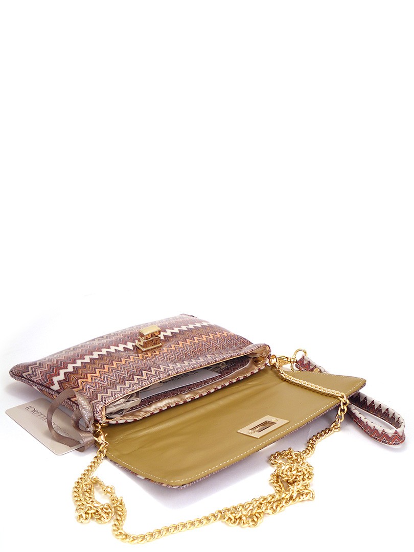 Сумочка-клатч из лаковой кожи с геометрическим рисунком напоминающим фирменные принты известного итальянского модного дома Missoni. Клатч застегивается на защелку, имеется короткая ручка, а также длинный ремешок из цепочки под золото. Внутри клатча на стенке карман на молнии для документов, подкладка - шелковистый сатин ванильного цвета.