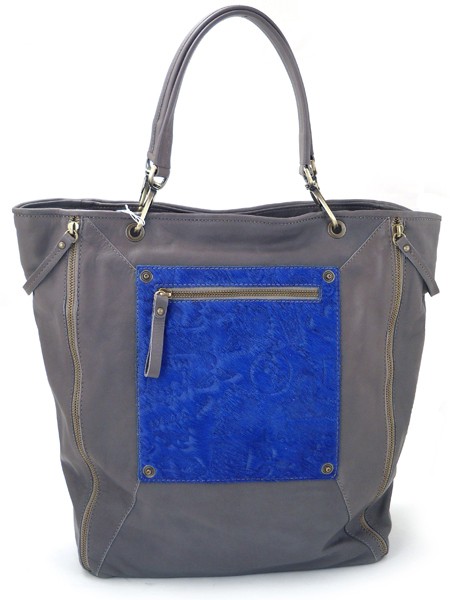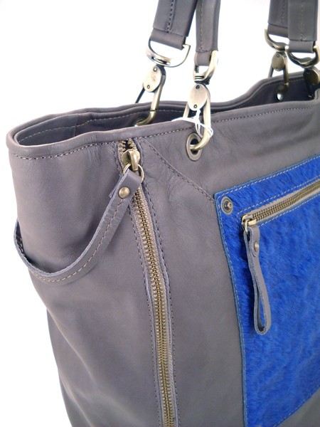 Серая кожаная сумка с синим каваллино итальянской марки BAGIA. По бокам 2 декоративные молнии. Спереди накладной на молнии карман с мехом синего пони.