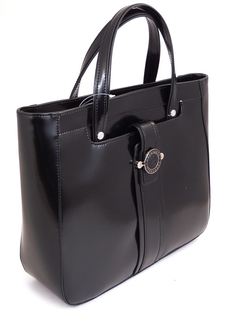 Большая черная деловая сумка -портфель из гладкой кожи. Шлифованная натуральная черная кожа с легким глянцем, фурнитура с фирменными логотипами.