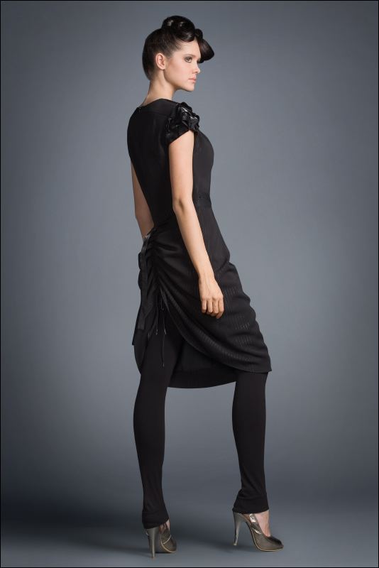 Сзади платье собирается при помощи шнурка, создавая подобие турнюра, что придает облику интригующий вид, делая его выразительным и запоминающимся