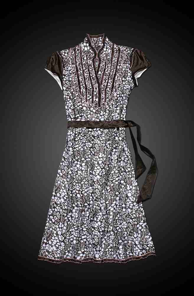 Платье приталенного кроя украшено вшитой манишкой на груди и дополнено окантованными рюшами.