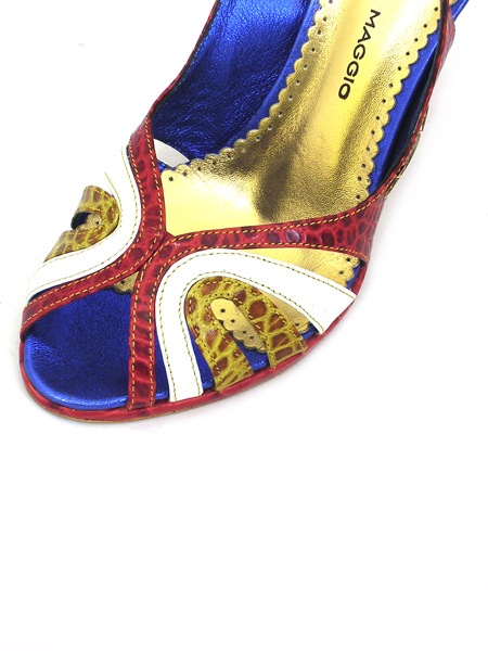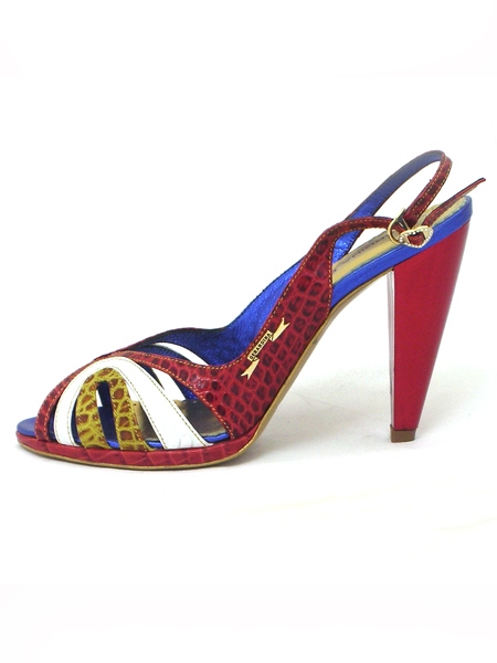 Материал - верх: натуральная кожа алого, молочного и золотистого цветов с имитацией под крокодила, подкладка из натуральной телячьей кожи василькового цвета; низ: подошва из натуральной кожи. Каблук 10 см.