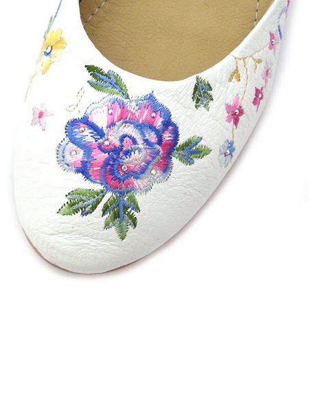 Материал: верх - натуральная кожа молочного цвета с яркой цветочной вышивкой, подкладка - шевро; низ - подошва из натуральной кожи. Каблук 1 см.